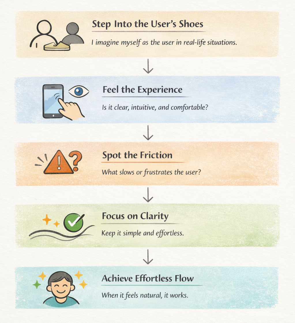 My approach to design is inherently human. I begin by placing myself in the user’s position and honestly asking how the experience feels—whether the interface is clear, intuitive, and comfortable to move through. I imagine real moments of use, not ideal scenarios, and pay close attention to what might confuse, slow down, or frustrate someone.